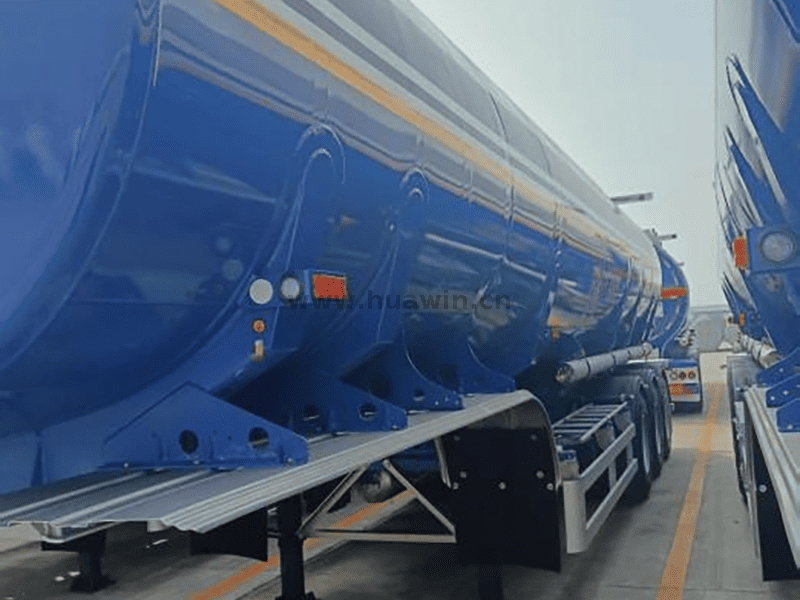 Mail Us: inquiry@huawin.cn The aluminum tanker body is not easy to generate static electricity. So, the security index is higher than the carbon steel tanker. Aluminum trailer and tankers' tare weight is also relatively lighter. So, it could down the transport cost. This trailer and tanker is designed for East African customer. Its loading capcity is 46,000 liters. The whole tanker body is divided into 6 compartments. The trailer is equipped with air suspension, the front axle is liftable. When the aluminum trailer and tanker runs without payload, the lifting axle could reduce the tire wearing. As this aluminum trailer and tanker will be sent to African market. So, it also adopts series of design for the purpose of security and reinforcement.